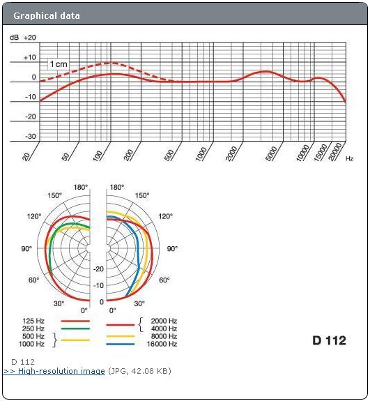 고역도 필요합니다. 어택음을 살려줘야 하기떄문이지여. D112는 저음 응답도 좋긴하지만. 보시는 바와 같이 주로 콘솔의 이큐에서 4Khz대역을 부스트 시켜서 킥소리의 어택감을 더하게 되는데.. 이미 부스트 되어 있기때문에.. 적은이큐잉으로도 어느정도의 소리를 뽑아주기에.. 기본은 하는 마이크로 알려져 있습니다.