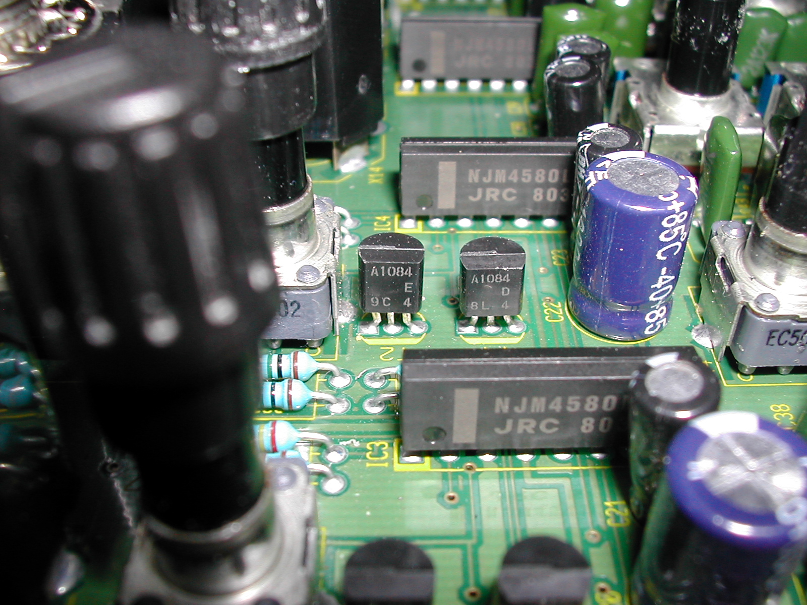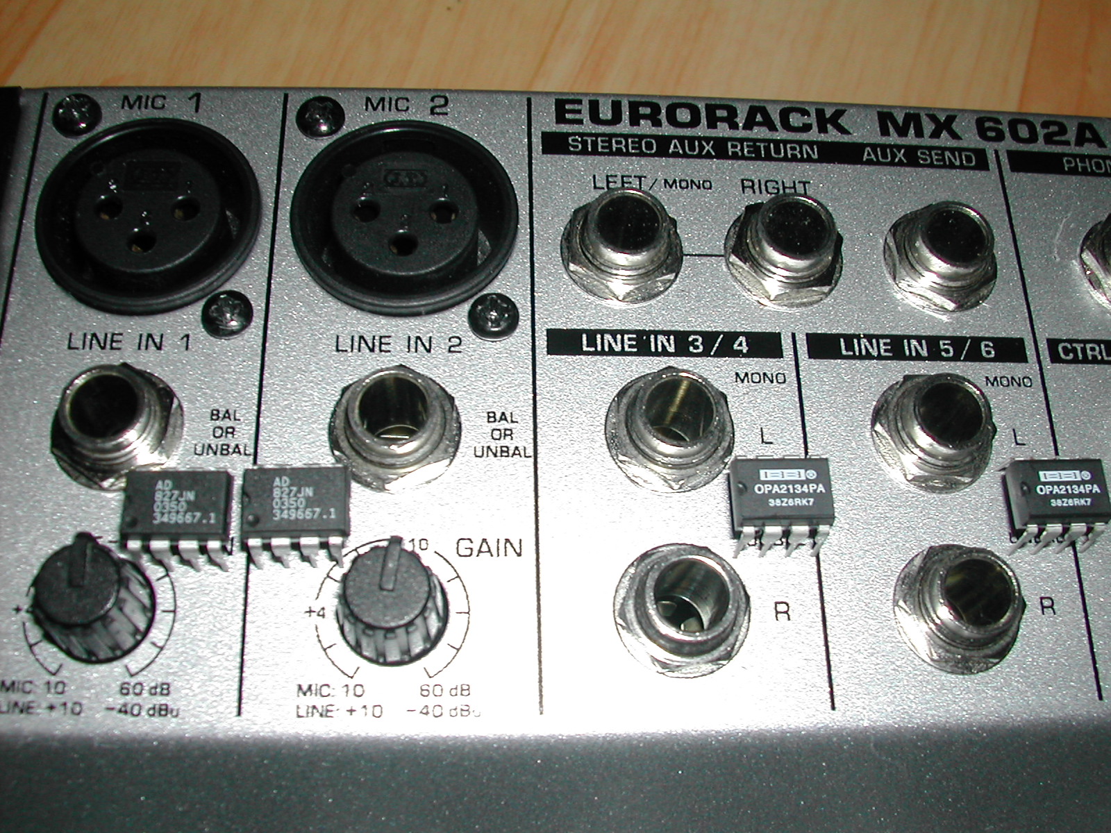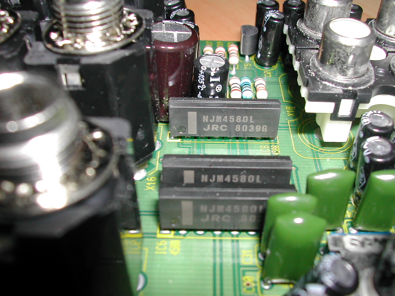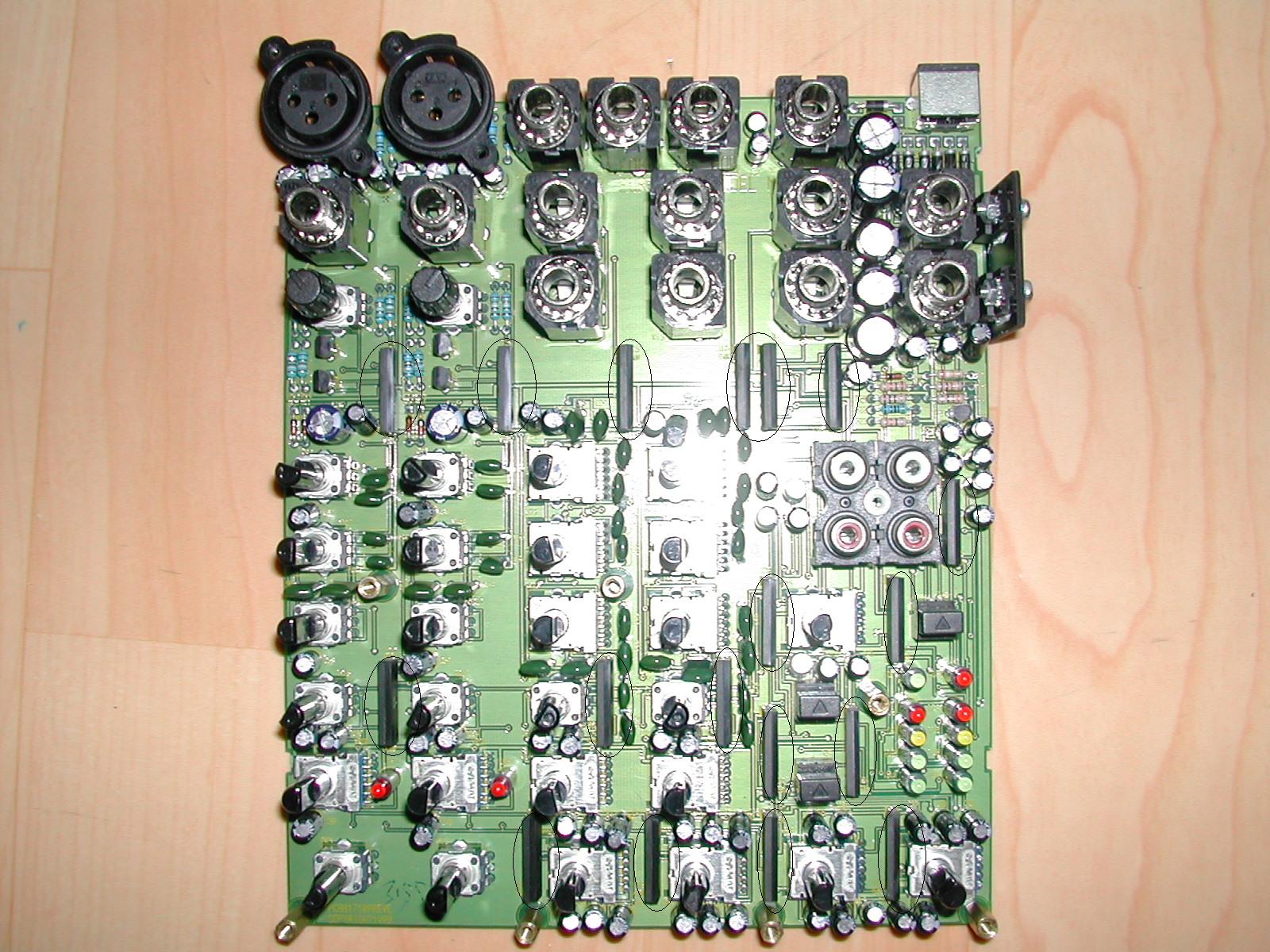 보드를 살펴보면 마이크 프리앰프부, 라인 프리 앰프부, 각 채널 볼륨부, AUX부 , Master 볼륨부, 헤드폰 출력부 등 총 18개의(사진상 타원형 표시부) JRC 4580L Dual OP AMP를 사용한 것을 알 수 있습니다. 베링거 메뉴얼 상에서는 초 저 잡음의 좋은 OP AMP를 사용했다고 했습니다만, 제가 조사해 본 바로 이 4580 OP는 하루 빨리 교체해야 할 대상이라고 하더군요.. - -