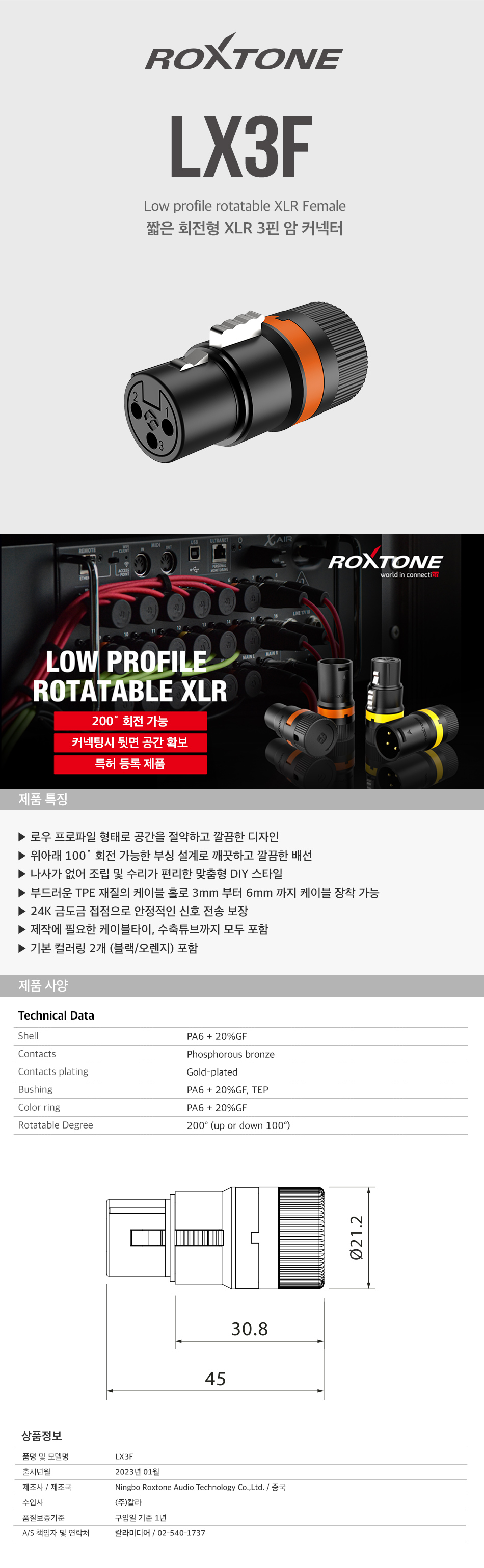 록스톤 LX3F /짧은 회전형 XLR 암 커넥터 /XLR Female/캐논잭가격