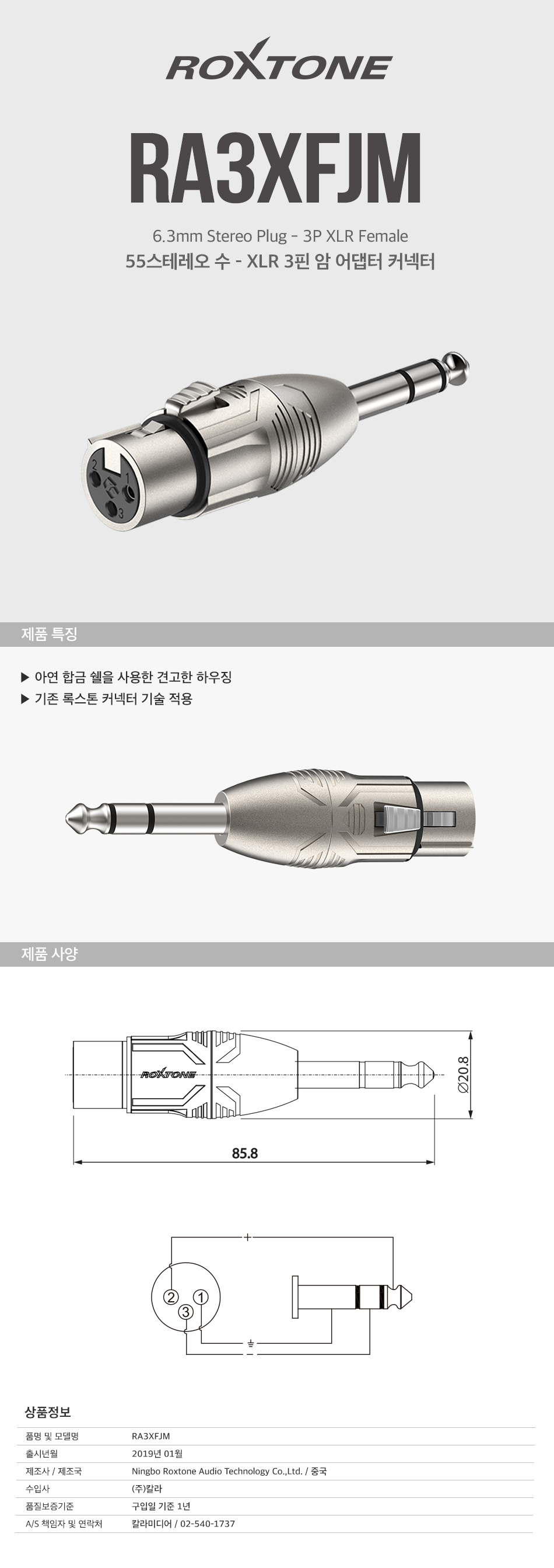 록스톤 RA3XFJM 젠더형커넥터 /55스테레오-XLR암 어댑터커넥터 /6.3mm Stereo-XLR Female가격