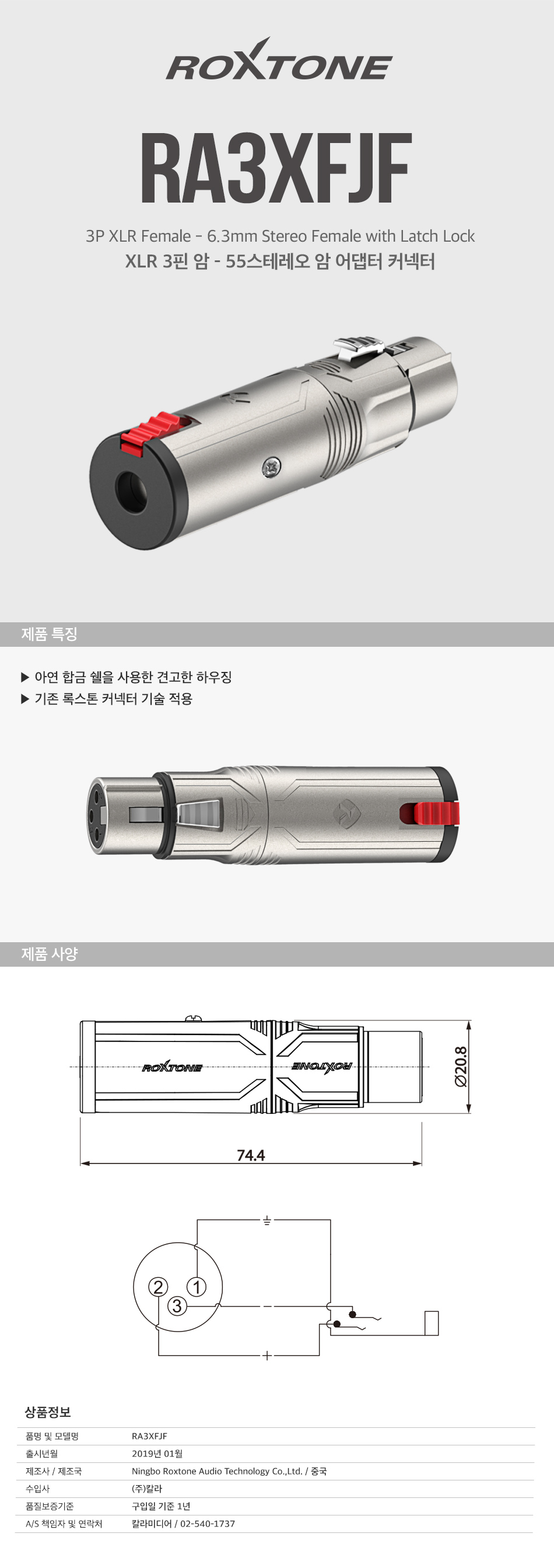 록스톤 RA3XFJF 젠더형커넥터 /XLR암-55스테레오암 어댑터커넥터 /XLR Female-6.3mm Stereo가격