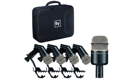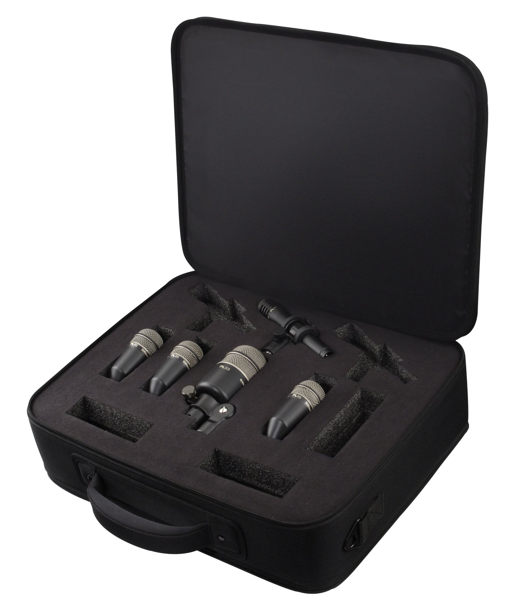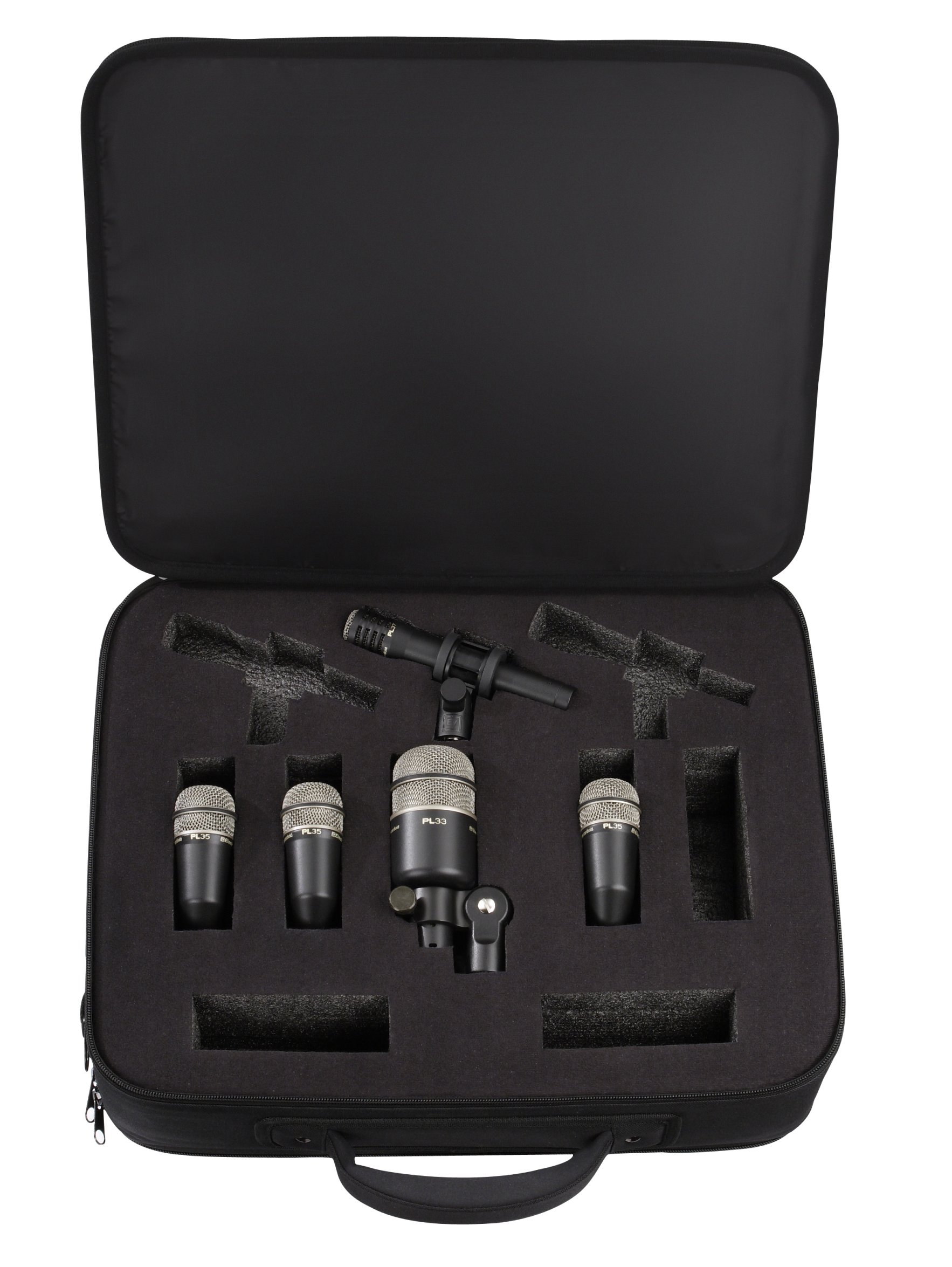 The PL DK5 is a ready-for-the-gig microphone solution for a five-piece drum kit containing one PL33 dynamic, supercardioid, kick drum mic, and four PL35 dynamic, supercardioid, tom/snare mics. The PL DK5 is packaged in a high-quality, firm-exterior 600 Denier nylon gig bag with shoulder strap.