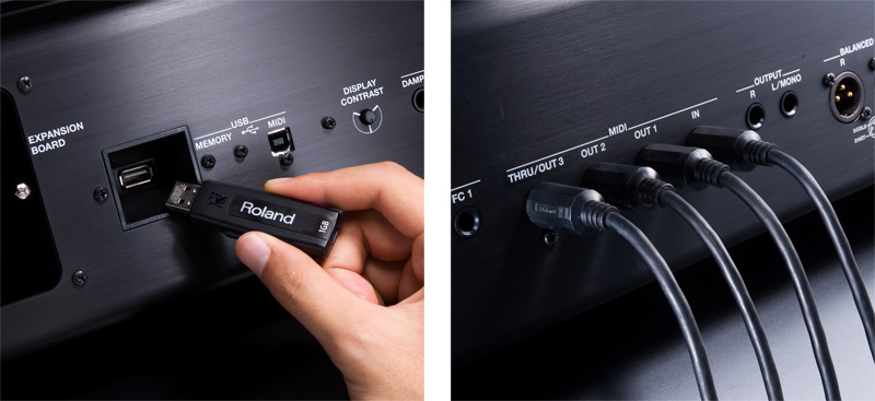 RD-700 GX는, 리어 패널에 USB 호스트(MEMORY) 단자를 탑재하고 있어 USB 메모리에 저장한 WAV/AIFF/MP3등의 오디오 파일이나 SMF 데이터를 직접 재생시킬 수가 있으므로, 백 그라운드 트랙에 맞춘 밴드의 리허설이나 개인 연습 등, 다양한 방법으로 활용할 수 있습니다.