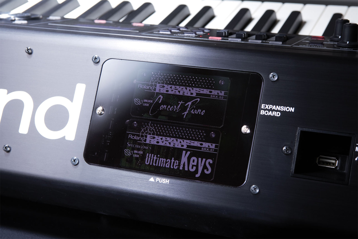 또, 롤랜드 피아노 디지털 KR시리즈나 HP시리즈, FP-7등으로 호평의 「피아노 디자이너」기능도 탑재하여 그랜드 피아노의 특성을 재현 하는 덤퍼 레조난스나 string 레조난스, 아리 코트등의 파라미터를 커스터마이즈 하는 것으로, 스테이지나 곡에 맞추어 기호의 피아노 음색을 만들 수가 있습니다. 그리고, 웨이브 익스펜션 보드 SRX 시리즈를 탑재 가능한 확장 슬롯을 2기 장비하고 있어 충실한 라인 업을 자랑하는 SRX 시리즈에 의한 다채로운 음색을 추가하는 것으로, 스테이지 키보드로서의 활약의 폭을 또한 넓히는 것이 가능합니다.